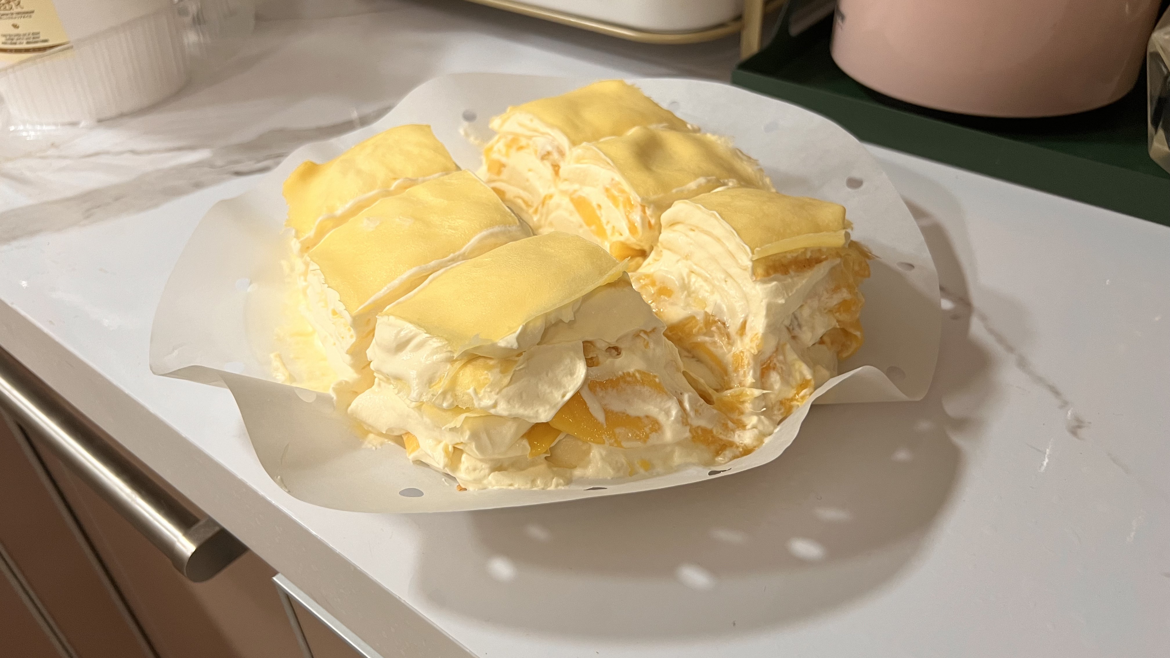 我第一次到嘉琪家做客的时候,她系着个小围裙,在厨房里飞来飞去。当时的我觉得:诶,有点可爱啊。当吃上她亲自做出的千层时,竟甜的我思绪纷飞了。